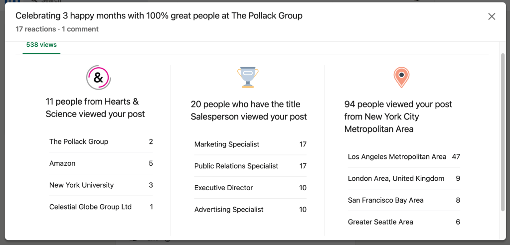 Under each post, there’s a section that shows the number of views as well as a brief description of people who have seen the post – their companies, titles and locations, summed up on a pop-up card. Users on premium plans have additional insights into visits to their profile pages. These are pretty much all the data-powered insights an individual user can get.