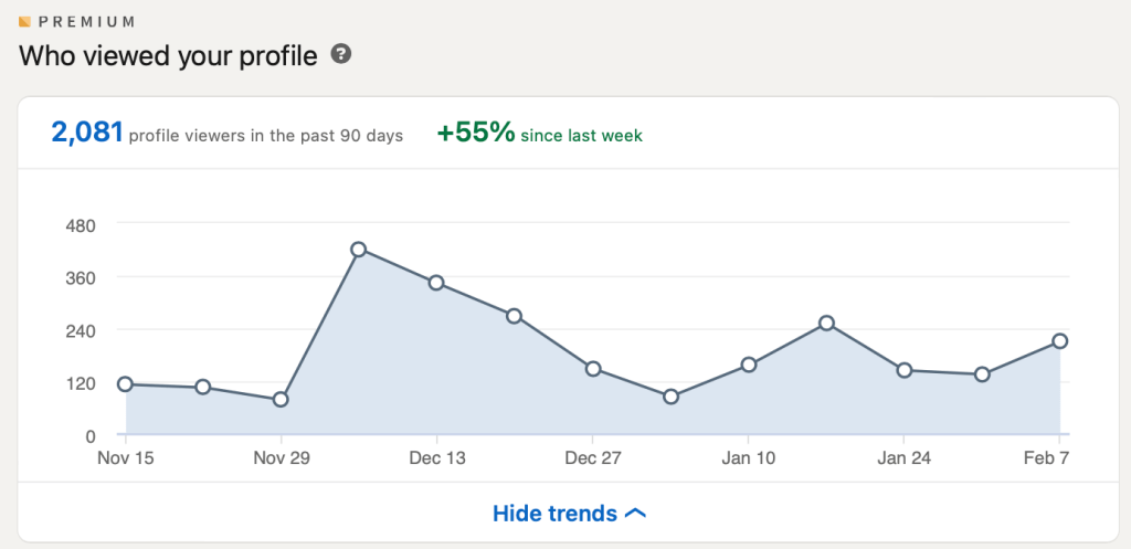 We can easily find a premium account’s weekly total profile views of the past 3 months on LinkedIn. Note that LinkedIn’s weekly views equal the sum of daily views in the past 7 days – if you’d like to track views over a long period of time, remember to take notes on the same day each week. This way, you get consecutive weekly totals that don’t overlap each other.
